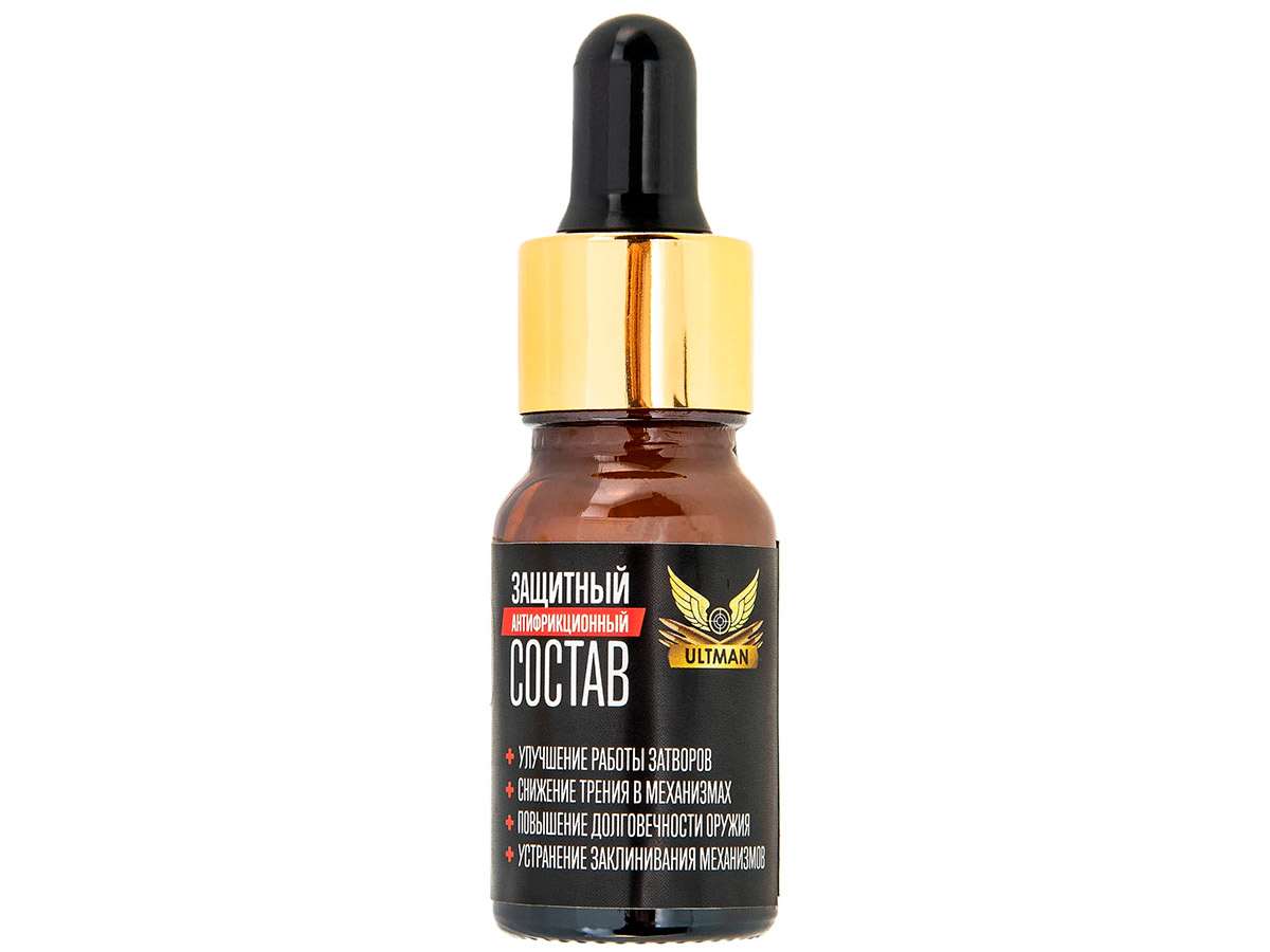 Защитный антифрикционный состав Ultman предназначен для проведения обработки всех видов стрелкового оружия с целью защиты поверхностей, подверженных трению и высокому износу, а также механизмов оружия, с целью предотвращения клинов и преждевременного выхода из строя. Существенно улучшает скольжение затворных групп, спусковых механизмов и прочих подвижных частей оружия.