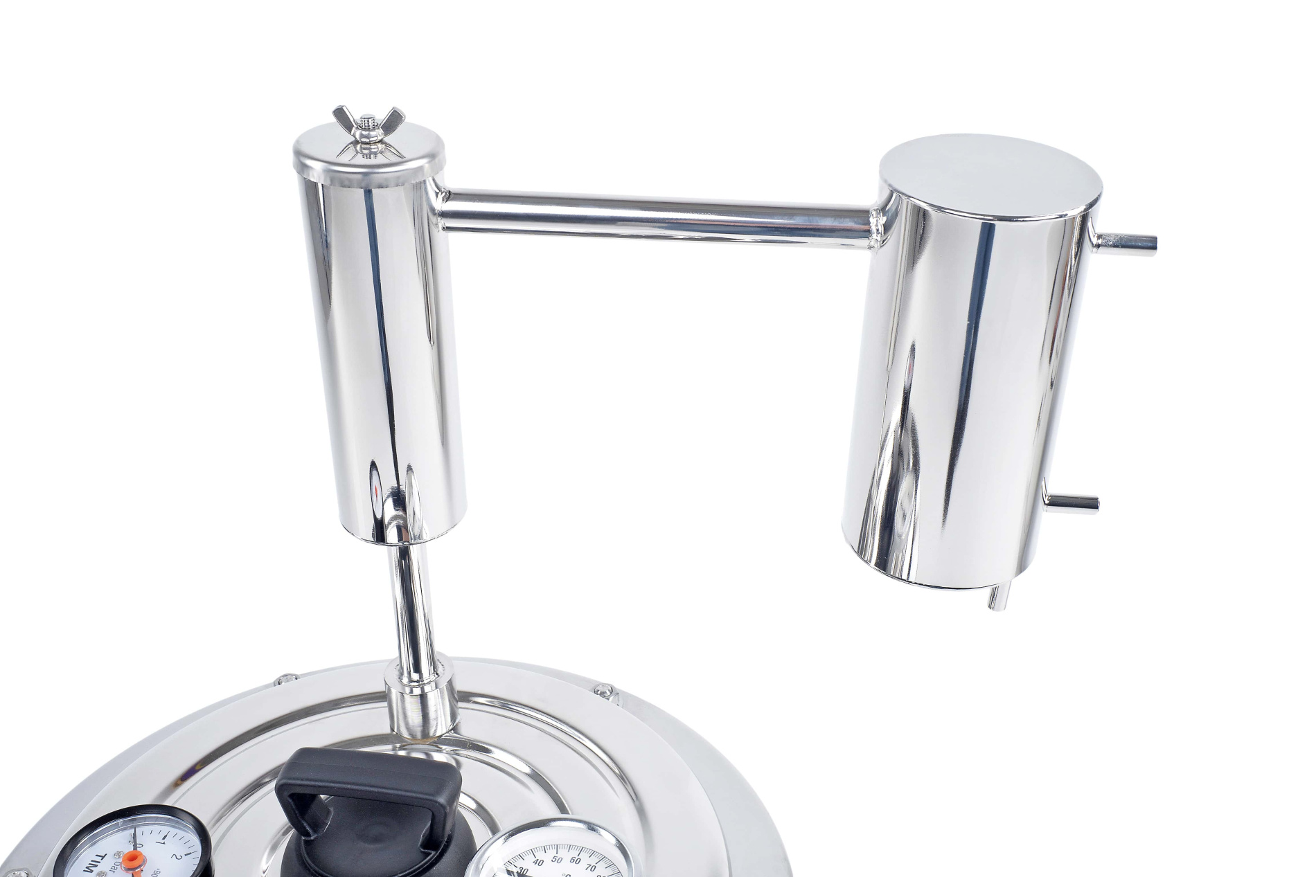 Дистиллятор состоит из сухопарника и вертикального холодильника. Он крепится к крышке консерватора вместо спускного клапана. Самогонная насадка выполнена из пищевой нержавеющей стали — долговечна, не окисляется и не дает металлического привкуса самогону.